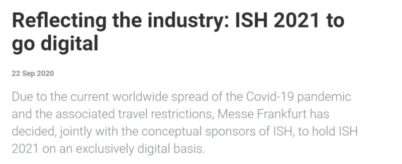 德國當?shù)貢r間9月22日,法蘭克福暖通制冷及衛(wèi)浴展覽會(ISH)主辦方發(fā)布《ISH 2021走向數(shù)字化》公告,由于新冠大流行的影響,法蘭克福展覽公司將不會在2021年1月至3月之間的法蘭克福展覽中心舉行任何實體貿(mào)易展覽會。